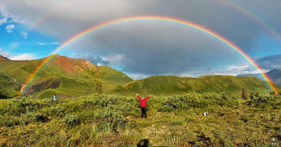 대기의 날줄과 씨줄로 직조해내는 웅대한 리듬이 현란하다. 순간순간 바뀌는 변화가 오묘하다. 복잡하면서 단순한 색채의 현란함은 차라리 경이롭다.지상에서 보이는 무지개는 화살모양으로 반원만 볼 수 있다. 그러나 공중에서 보면 무지개는 원형이다. 왜 그럴까? 물방울을 입체적으로 생각해 보자. 햇빛이 물방울에 비치면 물방울로부터 나오는 빛은 아이스크림콘처럼 원뿔 모양을 이룬다. 원뿔의 뾰족한 점(꼭짓점)을 시선의 위치라고 하면 무지개는 원기둥의 밑면인 원의 둘레처럼 보이게 된다. 그런데 우리가 보는 무지개의 모양이 반원인 것은 어떤 이유일까? 대개의 경우 무지개가 지면에 가리게 되어 반원처럼 보이기 때문이다. 그러나 만약 비행기(비행기의 위치는 원뿔의 꼭짓점)에서 무지개를 본다면 무지개는 분명 원 모양으로 보일 것이다. 그래서 찌그러진 무지개는 볼 수 없고, 무지개의 옆면이나 뒷면도 볼 수가 없는 것이다. 무지개는 항상 정면에서 보인다.